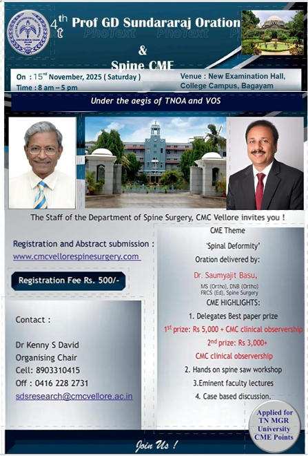 Applications are invited for the post of SENIOR RESIDENT in the Department of Spine Surgery, CMC Vellore,Tamil Nadu.